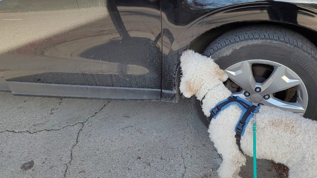 Here are two videos from a recent training session. In the first, he spends a few seconds sniffing the ground, which I think was actually the birch odor hitting the ground. There was a breeze coming towards us. [Notice that I let him sniff, I don’t nag him to “get to work” and I don’t gesture or direct him at the car] then he heads down towards the back of the car, and goes beyond the car, and again I let him, keeping a loose leash. He does a U turn all by himself—he has reached the edge of an odor cone—and then he starts detailing the back of the car. He pauses on the rear hatch – I think because he remembers having found a hide there last week, and he wants to rule that out—and then moves up the side of the car, clearly following an odor trail, up to the front license plate. He does this all without any direction or interference from me. Good boy! (I really should have given him a bigger reward).