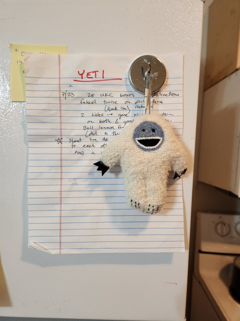 I have been noodling around with Yeti since May, experimenting with rewarding with his ball on some simple hides, doing a few very random interiors, reviewing a little obedience. This means I haven’t put a ton of thought into criteria. But now it is time to get down to it.