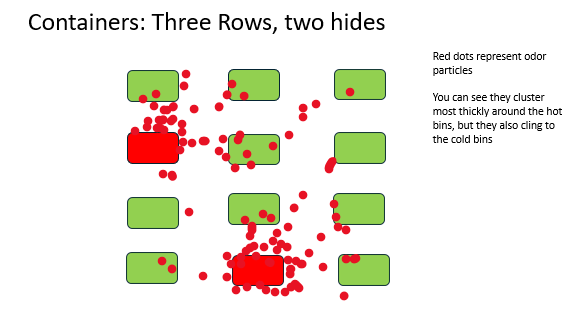 Here is a representation of three rows of containers with two hides. The dots represent odor molecules. You can see how much the odor is clinging to cold containers, and also how much it is colliding.