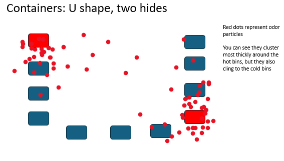 Here is a representation of a U shaped container search with two hides. You can see how much less the odor molecules are both clinging to the containers AND colliding with each other.